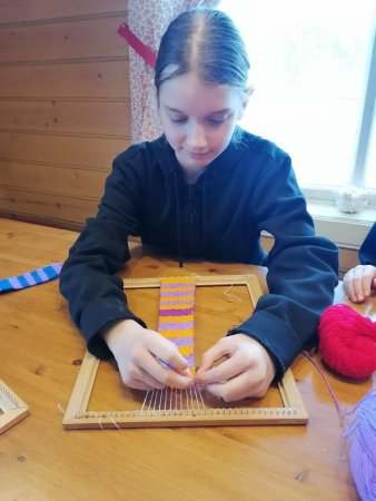 Перед тем, как сесть за новый инструмент, мастерицы освоят технику плетения на рамке с гвоздиками на одинаковом расстоянии друг от друга — на ней набирают нить основы для дальнейшей работы. Рамки для юных мастериц изготовили местные умельцы.