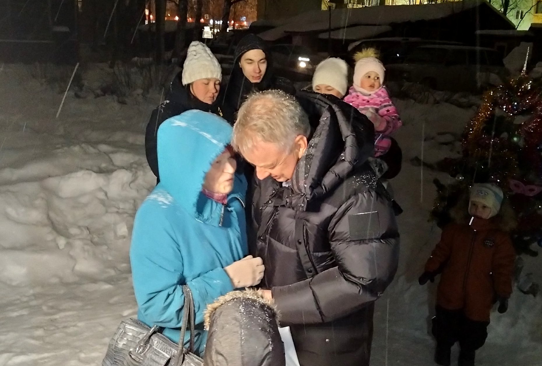 Большая семья Юрия Щепоткина встречала Деда Мороза и Снегурочку во дворе дома на ул. Полины Осипенко. На руках у Юрия Петровича самый младший – Илья. А рядом – Руслан, Кристина и Евгения.