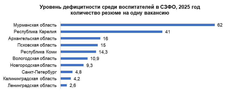 В целом по России дефицита воспитателей не наблюдается. На 1 вакансию приходится 7 резюме, что считается умеренной конкуренцией (норма 4,0-7,9). Однако в ряде регионов напряженная ситуация с кадрами сохраняется. Наиболее сильная нехватка воспитателей наблюдается в Ленинградской области – всего 2,6 резюме на вакансию, Нижегородской области – 3,7, Ульяновской области – 3,9. В свою очередь в СЗФО профицит соискателей сложился в Мурманской области (более 60 резюме на одну вакансию), а также в Карелии (более 40). Если же вдаваться в подробности и выяснять портрет соискателя, то аналитика показывает, что чаще всего это кандидаты 40+ лет с большим стажем, а вот молодых кадров, которые наполнили ли сферу и могли бы расти и развиваться профессионально, мало (менее 10%) и их сохранность в профессии крайне низка.