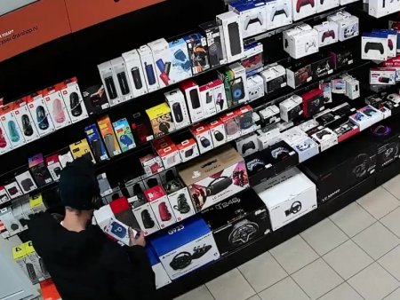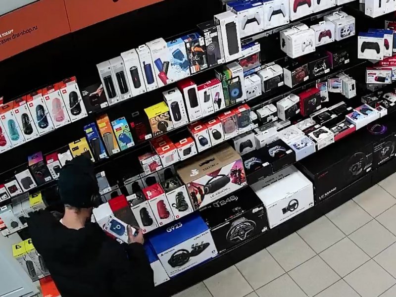 Действия злоумышленника попали в объектив камер видеонаблюдения. На них видно, как мужчина берет с прилавка электронику, прячет под куртку и, не оплачивая товар, уходит.