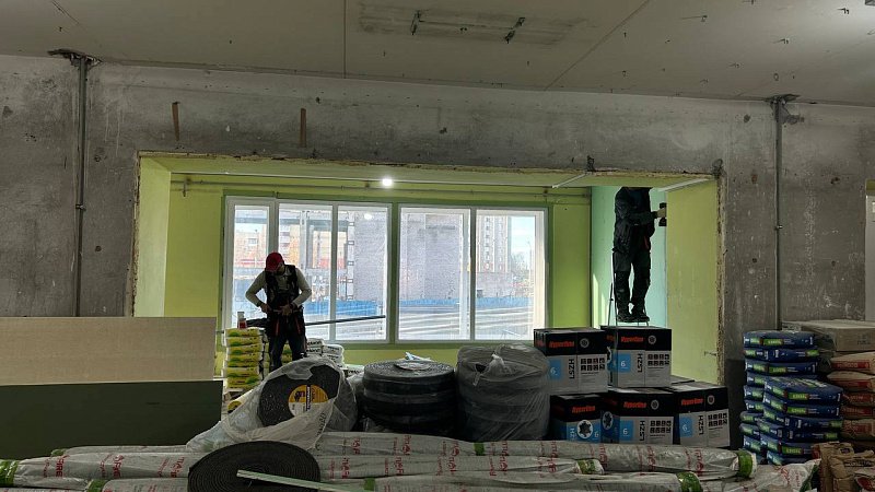 Здание обновляют по программе модернизации первичного звена здравоохранения. Уже заменили лифт, отремонтировали кровлю и входную группу, поставили новые окна. Сейчас монтируют систему отопления и электрокоммуникации, укладывают полы.