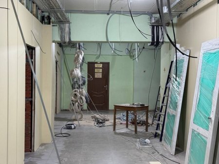 В здании взрослой поликлиники выполнены ключевые строительные работы: монтаж электрических сетей, установка окон и дверей, настил напольного покрытия. На финишной стадии — кабельный цикл, установка дверей в кабинетах и облицовка стен гипсокартоном.