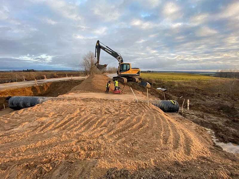 На данный момент, подрядчик смонтировал две новые водопропускные трубы, проводит укрепление дорожной одежды и мульчирование полосы отвода. К осени 2027 года планируется заасфальтировать 27 километров дороги.