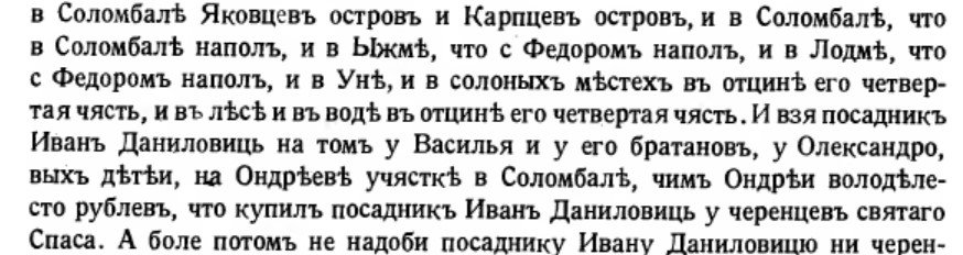 Таким образом, известное по документам время посадничества (1415-1417 годы) участника сделки новгородца Ивана Даниловича является аргументом для уточнения «официального возраста» Соломбалы. Если согласиться даже с его верхним пределом (1416 -1417 годы), в 2026 или 2027 годах можно отметить 610 лет со дня первого, подтверждённого документально упоминания Соломбалы.
